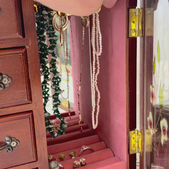 This stunning Vintage 1980s Gunther Mele wood jewelry box is a charming miniature armoire chest, offering beautiful and functional storage. This wooden mini wardrobe features four spacious drawers for rings and trinkets, alongside a magnificent floral glass door that opens to reveal a necklace carousel with hanging space.