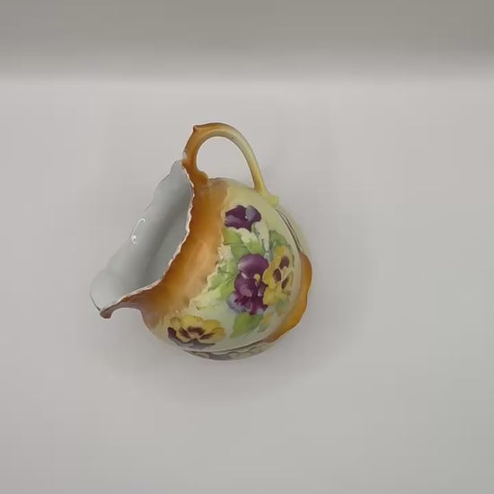 This hand-painted porcelain creamer and sugar bowl set features a delicate pansy floral pattern, possibly made in Bavaria, Germany. Each piece showcases fine craftsmanship and timeless beauty, ideal for collectors or as an elegant tea service accent.