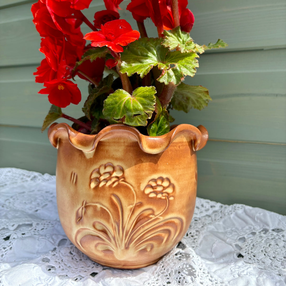 Unusual art pottery dish furled rim floral cut design signed Ninos Cyprus