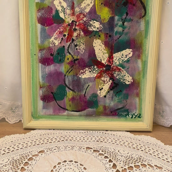 The painting uses vibrant colors, including magenta, purple, yellow, and green, applied with visible brushstrokes and a heavy texture.