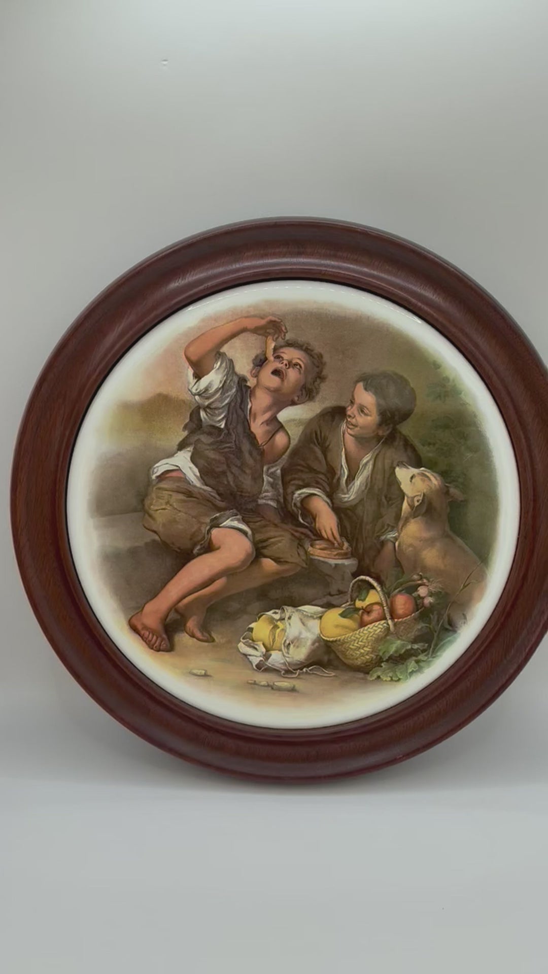 Round porcelain Plaque by Murillo Boys with wooden frame
