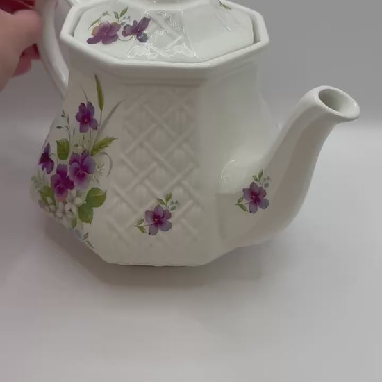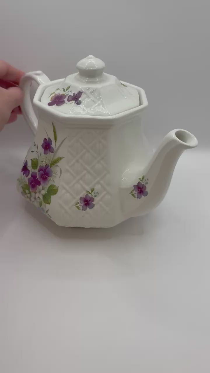 This lovely teapot features purple transfer-printed violets on a white basket weave background. It has an octagonal shape and is a vintage from 1960s.