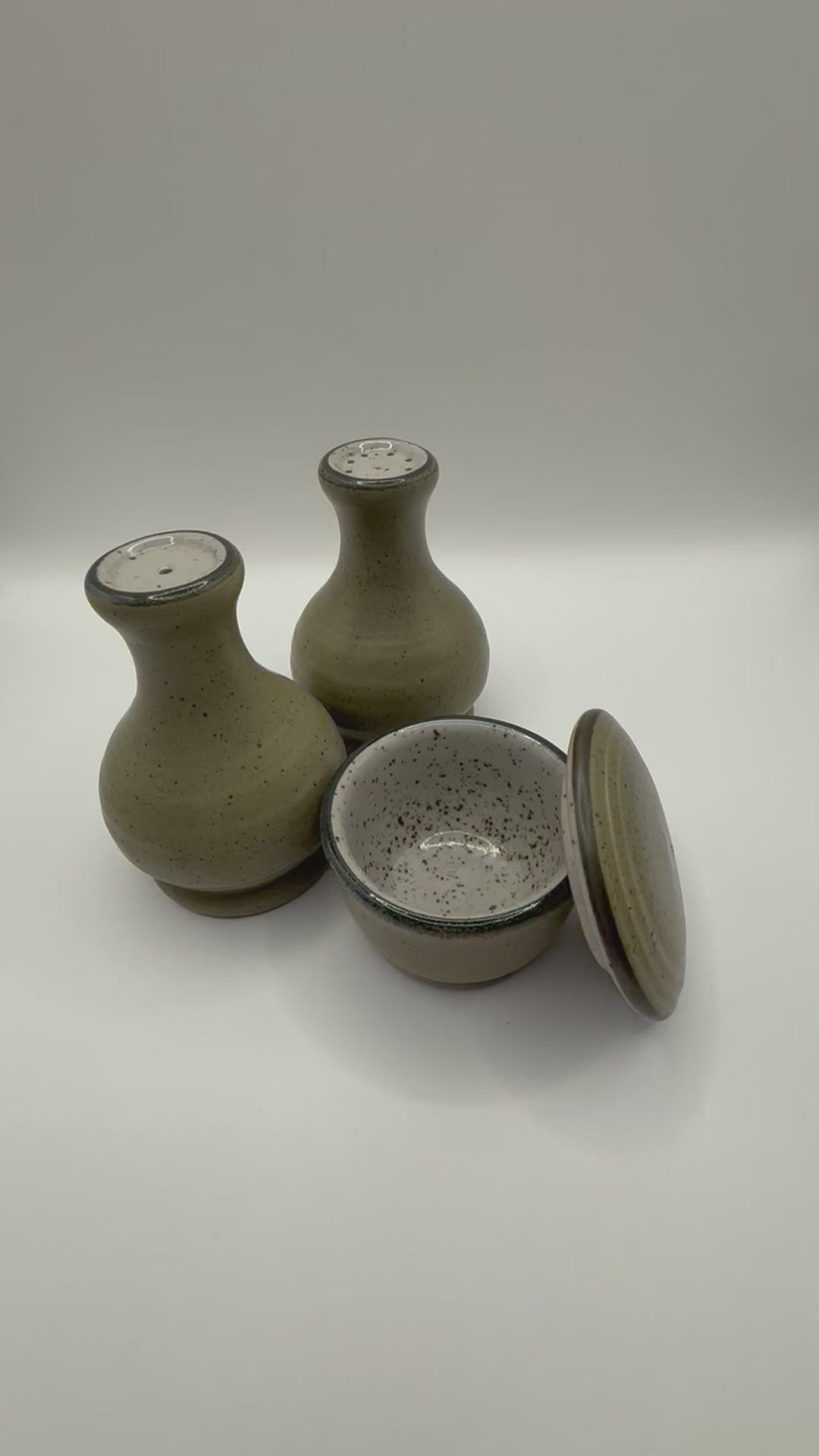 Salt and Pepper shakers with a bowl From Purbeck Pottery Studland