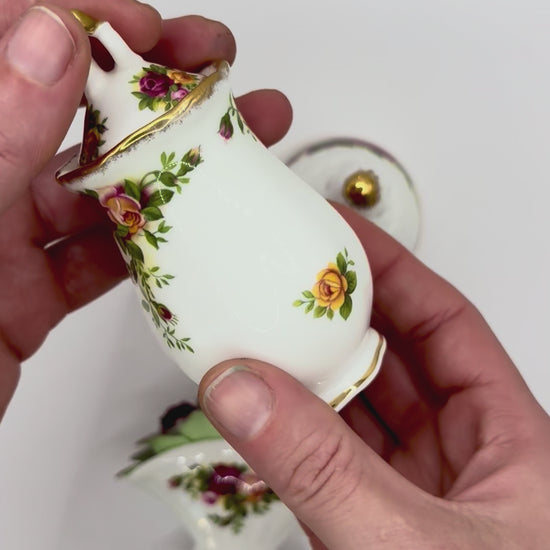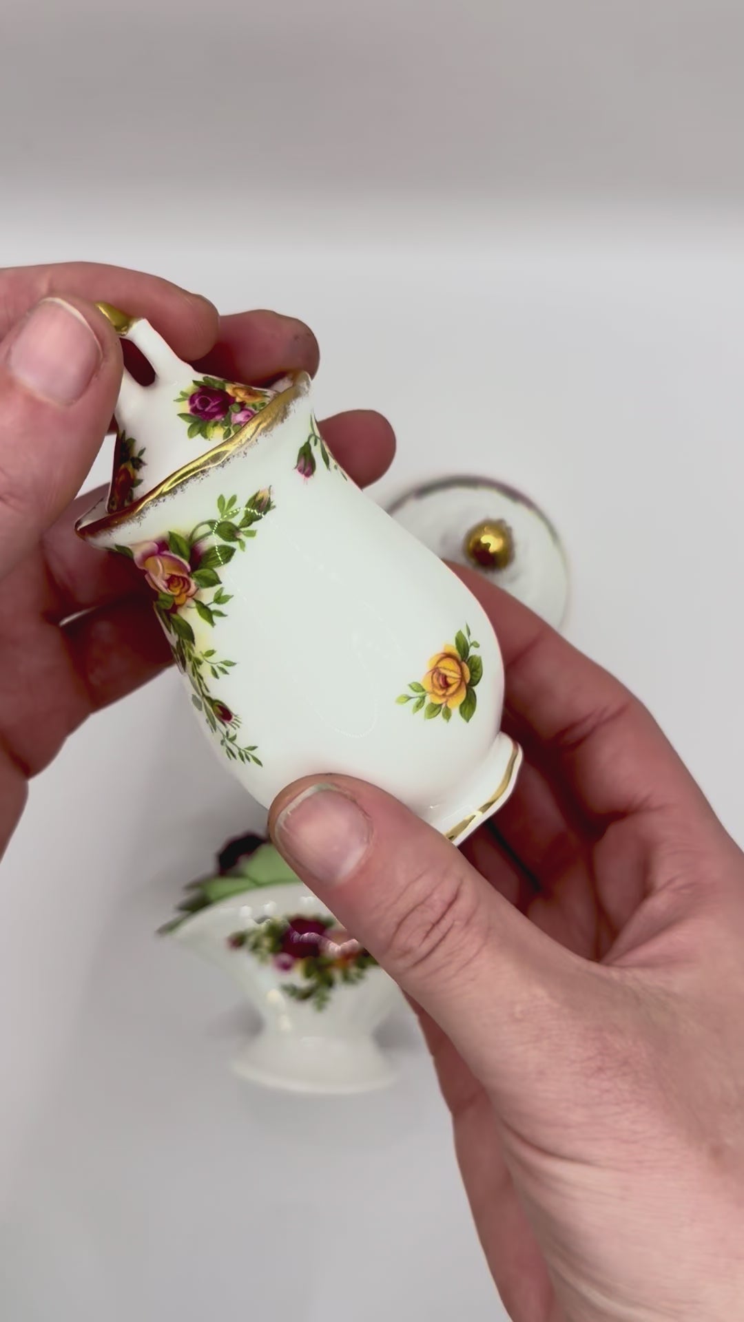 This charming set from the Royal Albert Old Country Roses collection includes three delicate ornaments: a small urn with lid, a bell, and a flower basket.