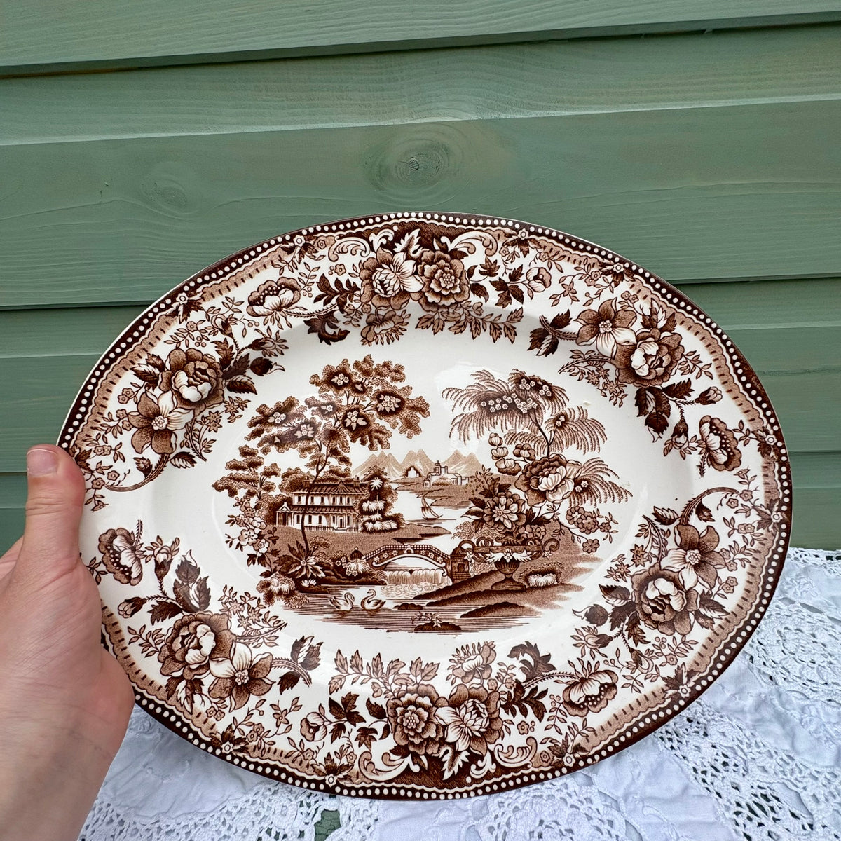 Produced by Alfred Meakin of Staffordshire, England in the 1950s it features an Oriental river scene in the centre. The platter is part of the Alfred Meakin 'Tonquin' series. Tonquin is a Vietnamese region.