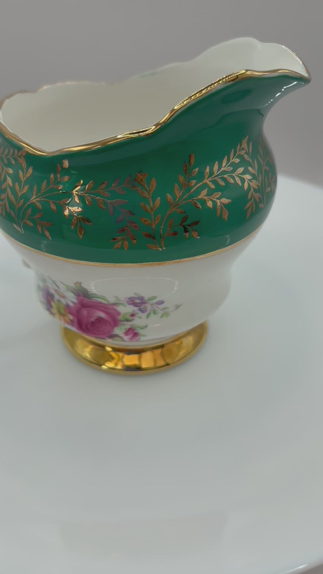 Royal Imperial Bone China, made in England. The green and gold design, along with the floral patterns, are characteristic of this brand’s vintage pieces.