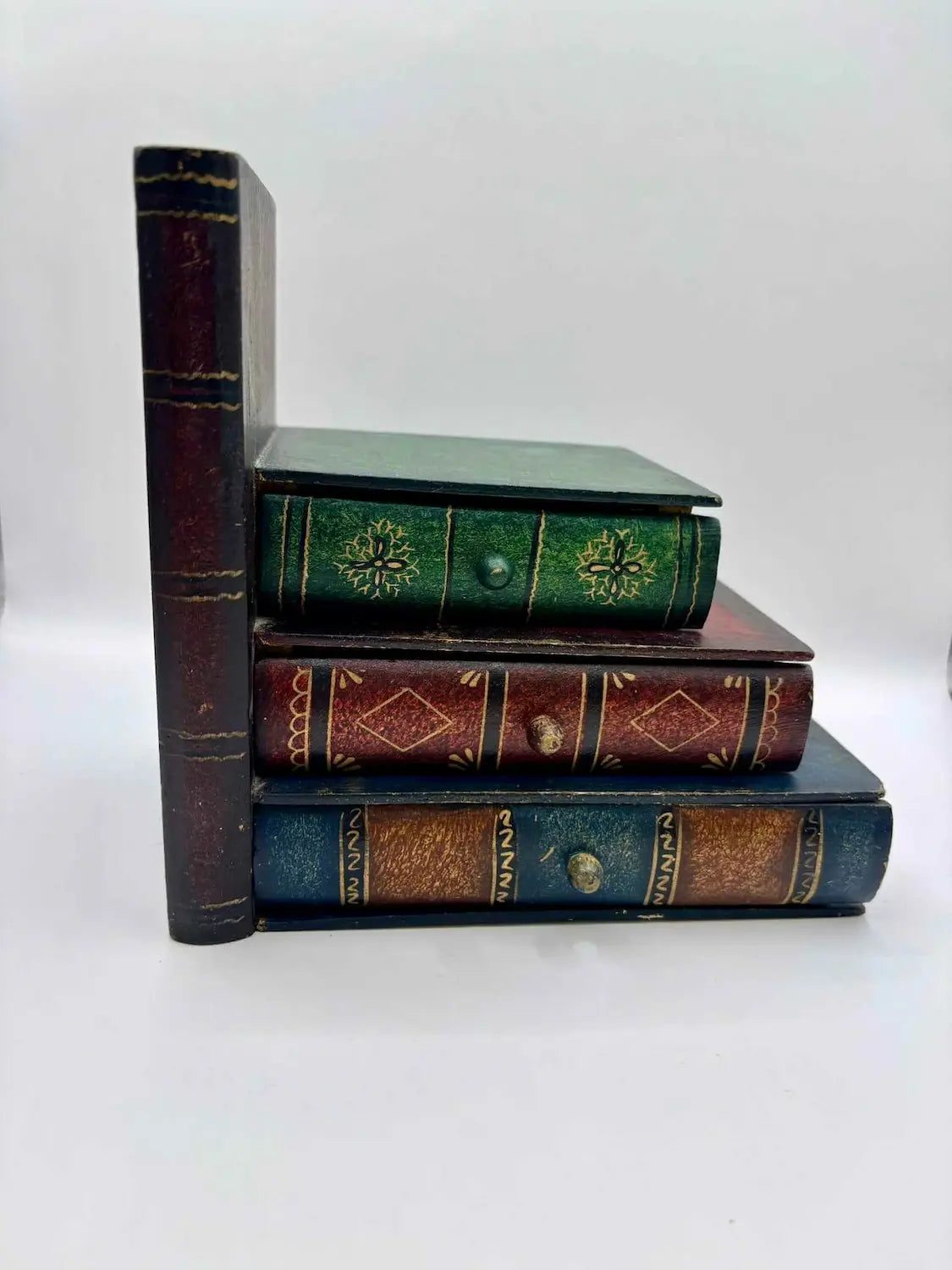 Vintage Faux Bookend Wood Storage Box, 3 Drawers styled as a faux stack of three books. This wooden book bookend storage box features three removable drawers with round knobs and makes a charming book lover home decor accent. Ideal as a vintage desk storage organizer, jewellery box or trinket drawer set.