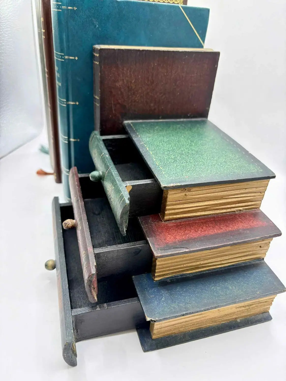The drawers slide smoothly for easy use and this faux book drawer box design blends perfectly on a bookshelf, desk or dressing table. Good vintage condition, please see the pictures. The books for the picture are not for sale, only shown for inspiration.