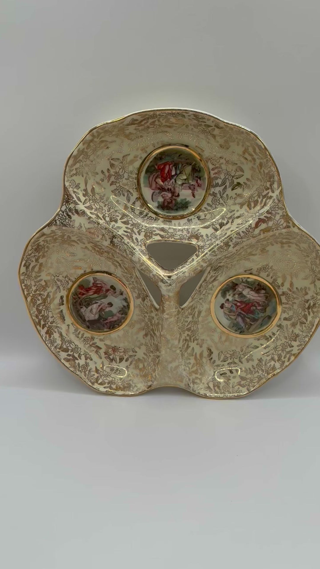 Vintage 1947 Empire England 3 Scene Bowl Serving Platter Dish | 1940s Collectible English Porcelain | Gilded Triple Snack and Nibble Server