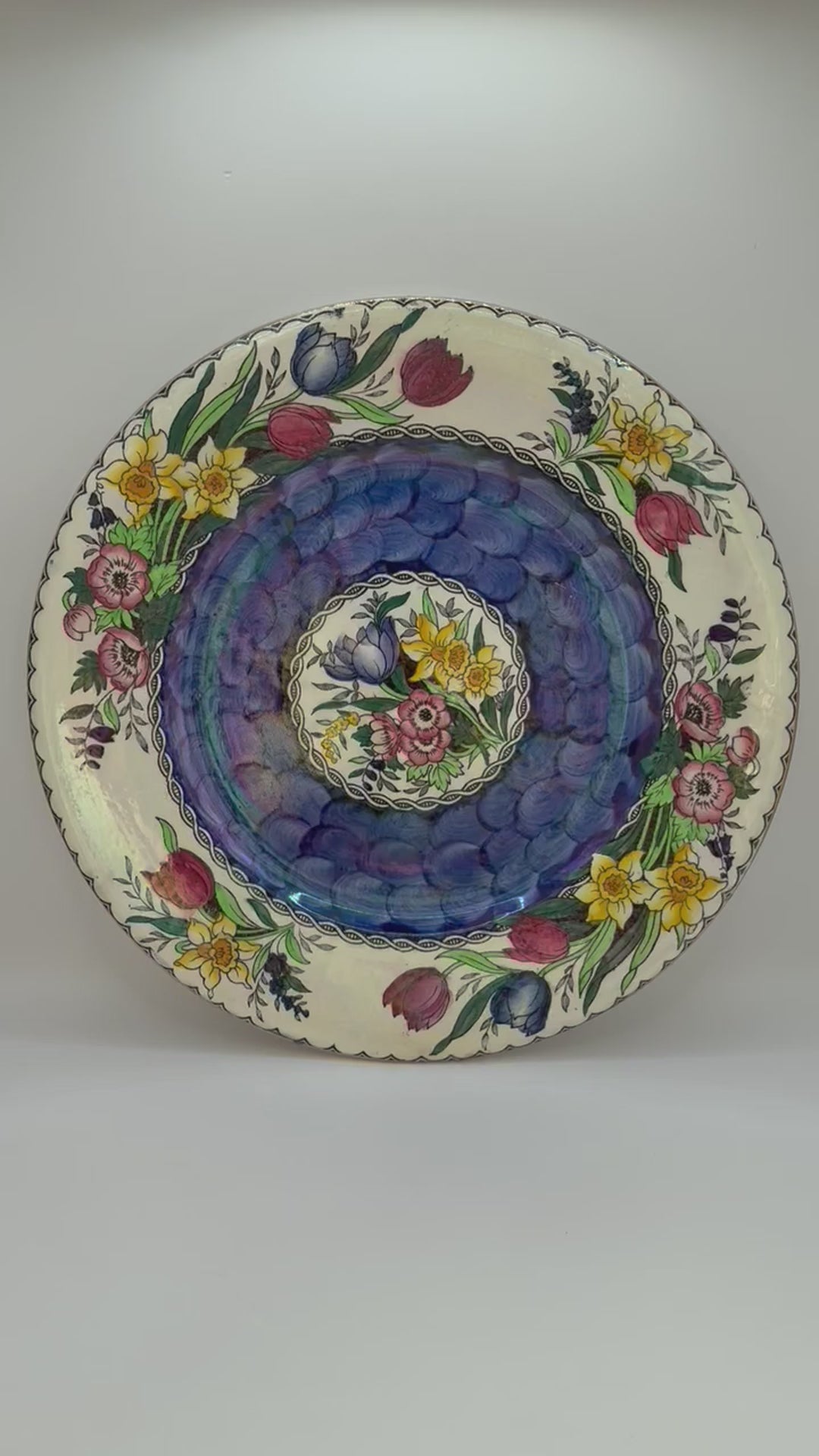 Vintage Original 1950s Maling Springtime Blue Lustreware Thumbprint English Ceramic Pottery Plate, Maling Newcastle on Tyne, pattern number 6526, Hand Painted Floral Motifs along the Cream Colored Rim, including Tulips and Daffodils.