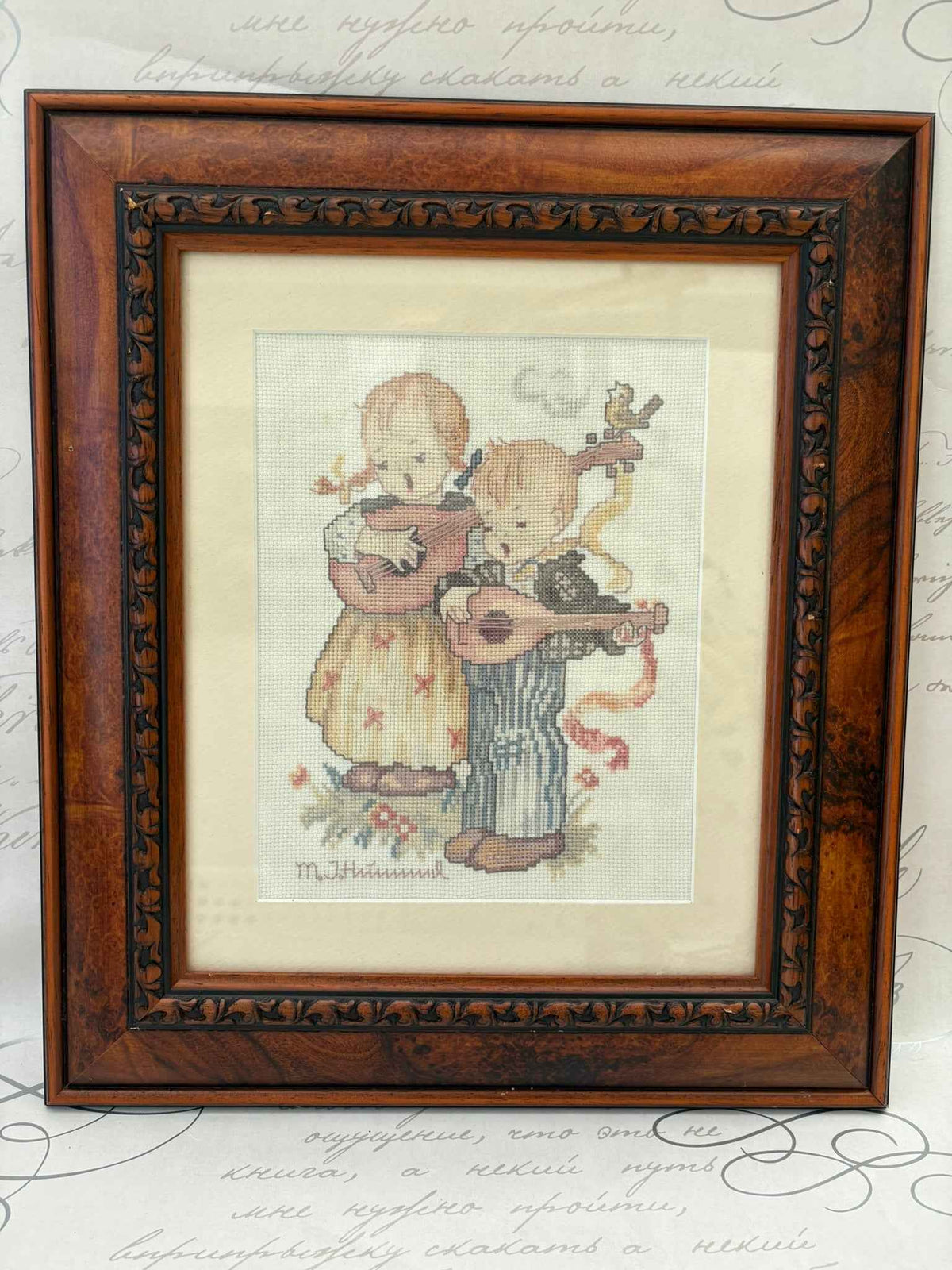 This vintage Hummel style cross stitch girl and boy embroidery is a charming finished and framed needlework piece featuring two children playing musical instruments, inspired by the sweet M.I. Hummel illustration style. The artwork is presented in a dark, ornate wood frame, perfect for country cottage wall decor or adding warmth to a nursery-style vintage wall hanging.