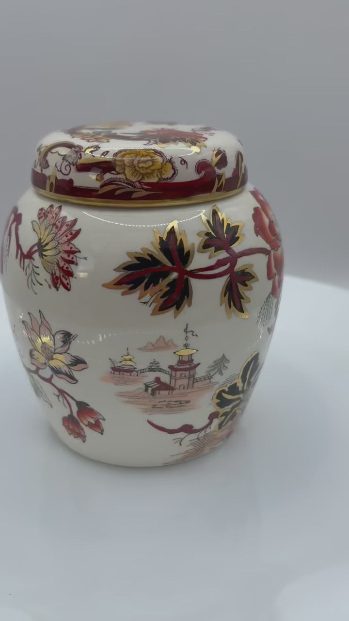 Rare vintage Masons Pattern: Brown Velvet colour Ginger Jar c1930s With gilt. Lovely lidded jar. Back stamps: Mason's Patent Ironstone Brown Velvet Made in England, also with Printed and Hand painted.