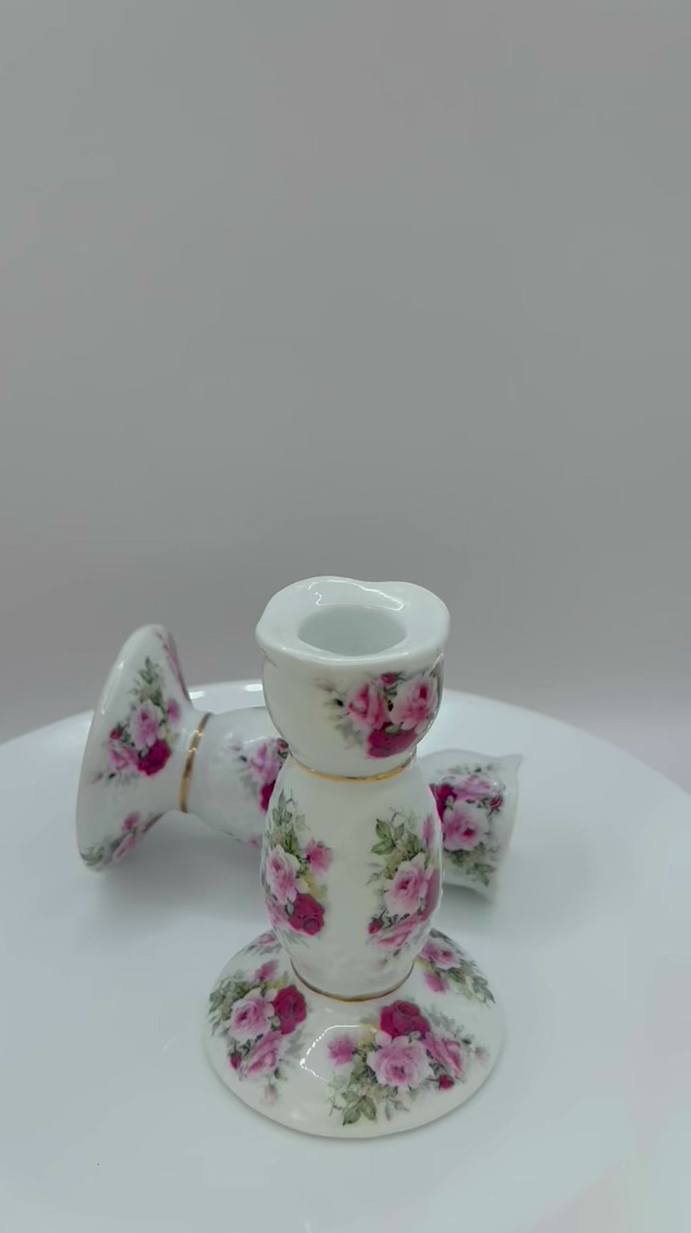 A pair of Leonardo Collection Pretty Bone China Cottage Rose Pattern Candlesticks.
