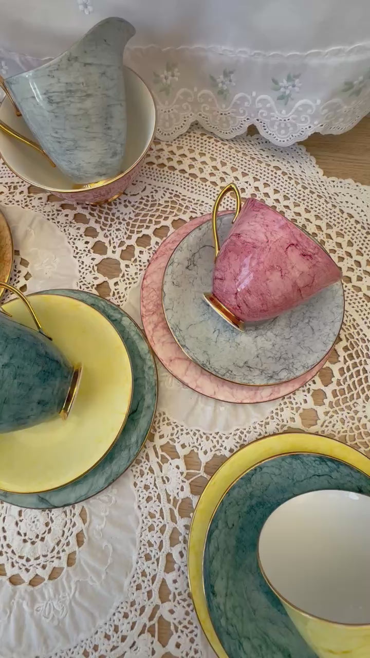 This Vintage Royal Albert Bone China Gossamer 20Piece Tea Set is a classic and elegant addition to any tea lover's collection. Made in England with a glossy finish, these round tea cups and saucers feature a beautiful multicolored Gossamer pattern, perfect for all occasions. The set includes 20 pieces: 6 trios and a sugar bowl with creamer, all made of high-quality bone china, and bears the Royal Albert backstamp.