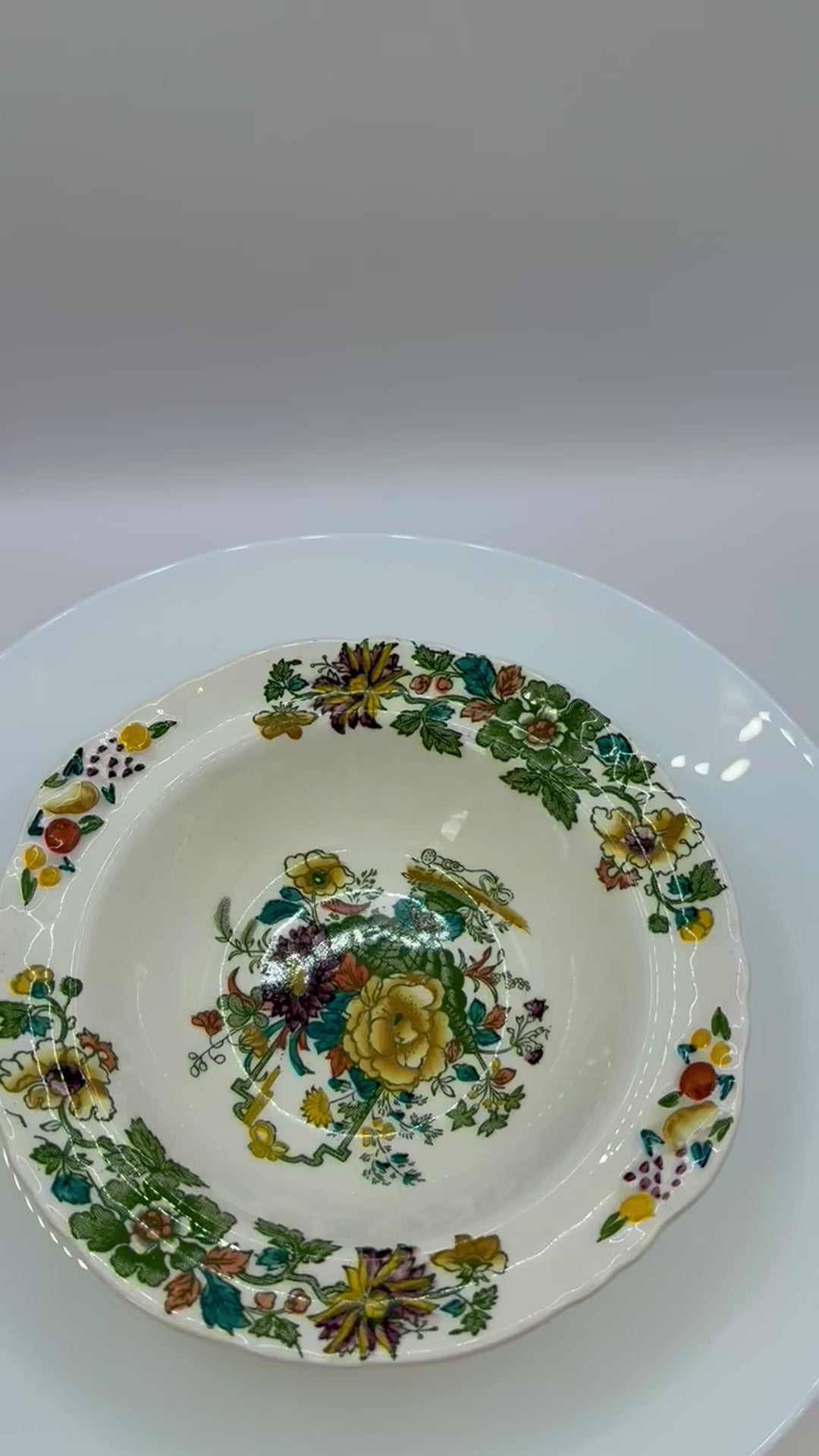 These are Mason's Ironstone China bowls in the Strathmore pattern. This pattern features a floral design with green and yellow being the dominant colours.